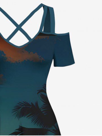 Plus Size Coconut Tree Ombre Dusk Print Hawaii Cold Shoulder Crisscross A Line Maxi Dress - Black - M