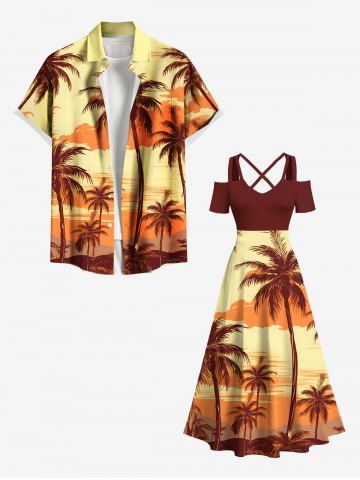 Plus Size Coconut Tree Ombre Dusk Print Hawaii Cold Shoulder Crisscross A Line Maxi Dress - Yellow - S