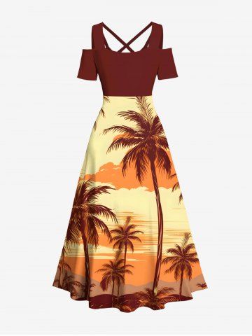 Graphic Dresses > Plus Size Coconut Tree Ombre Dusk Print Hawaii Cold Shoulder Crisscross A Line Maxi Dress