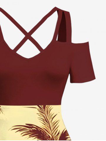 Plus Size Coconut Tree Ombre Dusk Print Hawaii Cold Shoulder Crisscross A Line Maxi Dress - Yellow - L