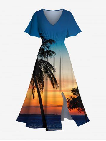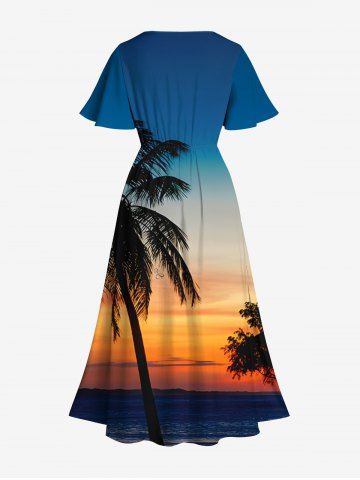 Plus Size Coconut Tree Ombre Dusk Print Hawaii Split Pocket A Line Midi Dress - Blue - 4x