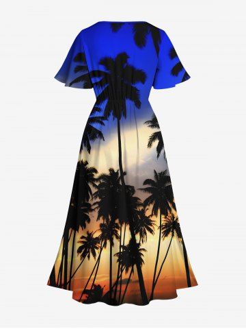 Plus Size Coconut Tree Ombre Dusk Print Hawaii Split Pocket A Line Midi Dress - Blue - Xxs