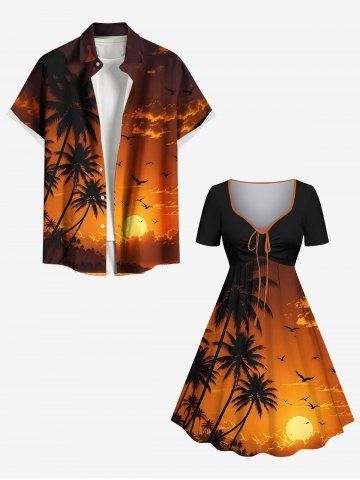 Plus Size Coconut Tree Ombre Dusk Sunset Print Hawaii Cinched A Line Dress - Orange - 1x