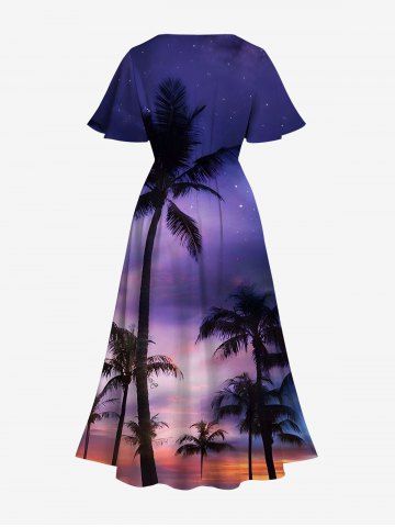 Plus Size Coconut Tree Ombre Galaxy Dusk Print Hawaii Split Pocket A Line Midi Dress - Purple - 6x