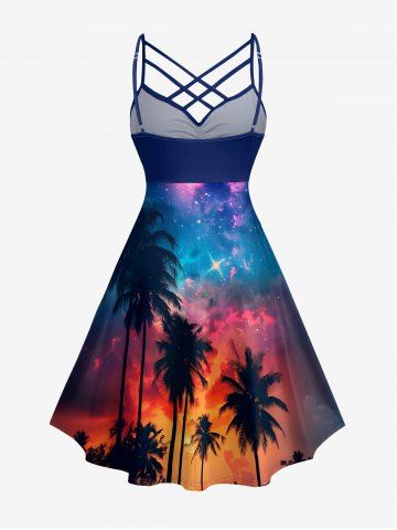 Plus Size Coconut Tree Ombre Galaxy Print Hawaii Ruched Crisscross Strappy A Line Cami Dress - Deep Blue - 6x
