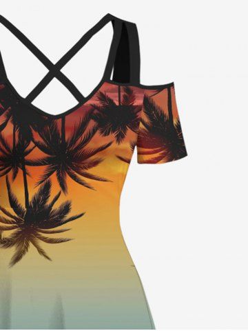 Plus Size Coconut Tree Ombre Print Cold Shoulder Crisscross Hawaii Maxi Dress - Coffee - 1x