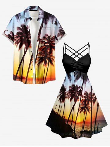 Plus Size Coconut Tree Ombre Print Ruched Lattice Crisscross Straps Hawaii Dress - Black - Xxs