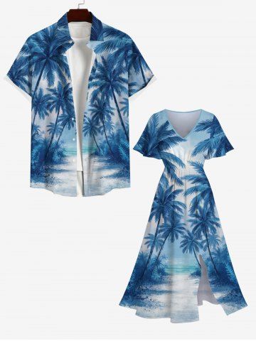 Plus Size Coconut Tree Ombre Print Split Hawaii Midi Dress - Sky Blue - M