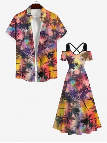 Plus Size Coconut Tree Ombre Printed Cold Shoulder Hawaii Dress - Multi-a - Xs