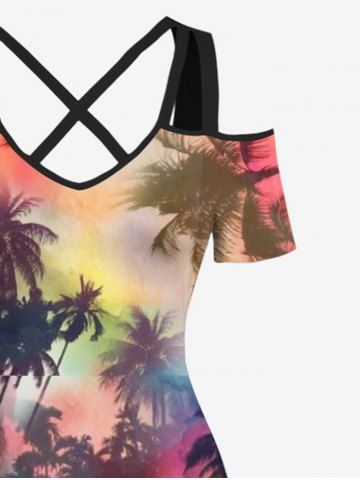 Plus Size Coconut Tree Ombre Printed Cold Shoulder Hawaii Dress - Multi-a - 5x
