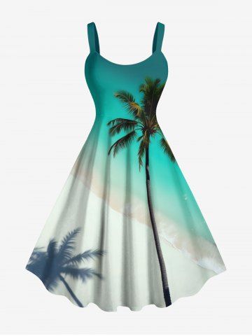 Plus Size Coconut Tree Ombre Sea Beach Print Hawaii A Line Tank Dress - Green - L