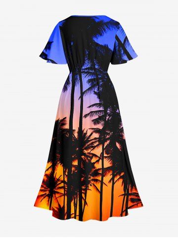 Plus Size Coconut Tree Ombre Sky Dusk Print Hawaii Split Pocket A Line Midi Dress - Navy Blue - Xs