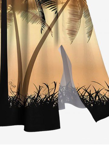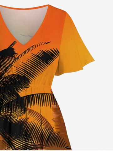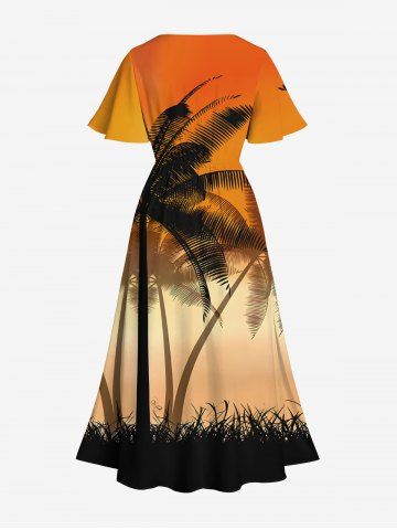 Plus Size Coconut Tree Ombre Sky Grass Print Hawaii Split Pocket A Line Midi Dress - Dark Orange - Xs