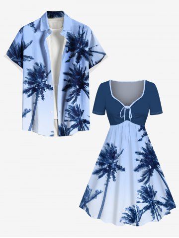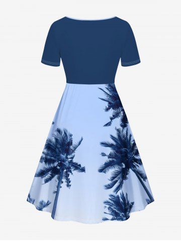 Plus Size Coconut Tree Ombre Sky Print Hawaii Cinched A Line Dress - Blue - 2x