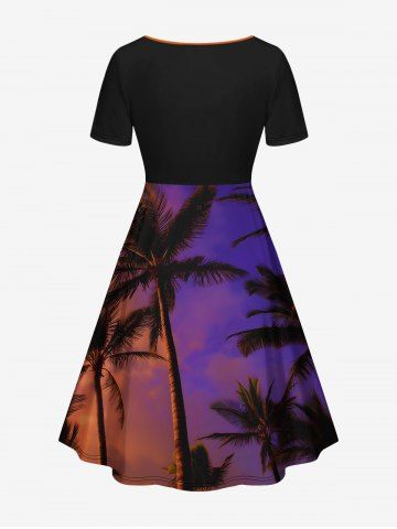 Plus Size Coconut Tree Ombre Sky Print Hawaii Cinched A Line Dress - Black - Xxs