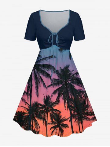 Plus Size Coconut Tree Ombre Sky Print Hawaii Cinched A Line Dress - Deep Blue - 5x