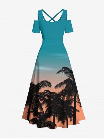 Graphic Dresses > Plus Size Coconut Tree Ombre Sky Print Hawaii Cold Shoulder Crisscross A Line Maxi Dress