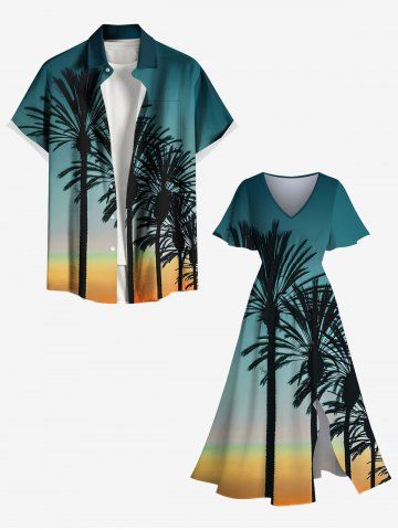 Plus Size Coconut Tree Ombre Sky Print Hawaii Split Pocket A Line Midi Dress - Green - 5x