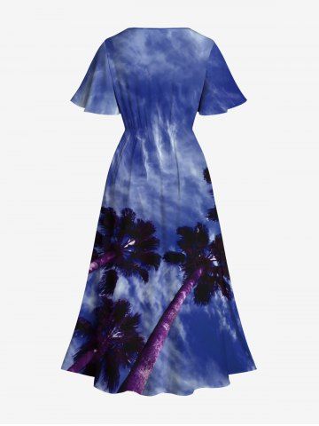 Plus Size Coconut Tree Ombre Sky Print Hawaii Split Pocket A Line Midi Dress - Sky Blue - M