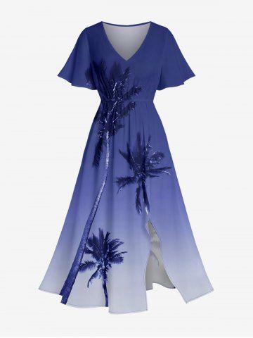 Plus Size Coconut Tree Ombre Sky Print Hawaii Split Pocket A Line Midi Dress - Blue - Xxs
