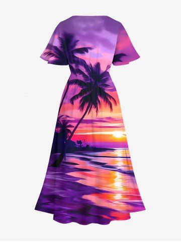 Plus Size Coconut Tree Ombre Sky Sunset Print Split Hawaii Midi Dress - Purple - Xs