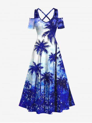 Plus Size Coconut Tree Ombre Tie Dye Sparkling Sequin 3D Print Cold Shoulder Crisscross Hawaii Maxi Dress - Blue - Xs