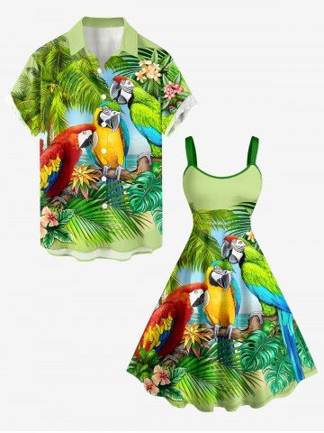 Plus Size Coconut Tree Parrot Tropical Leaf Print Hawaii A Line Dress - Green - 3x
