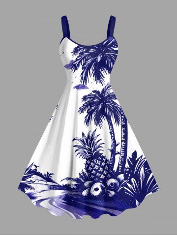 Plus Size Coconut Tree Pineapple Cloud Print Hawaii Tank Dress - White - L