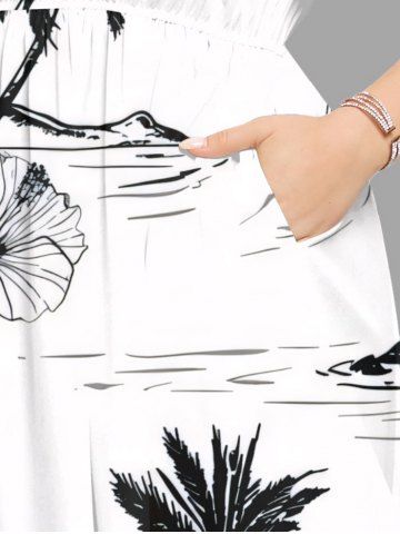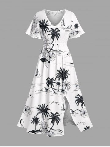 Plus Size Coconut Tree Pineapple Hibiscus Flowers Print Split Hawaii Midi Dress - White - Xs