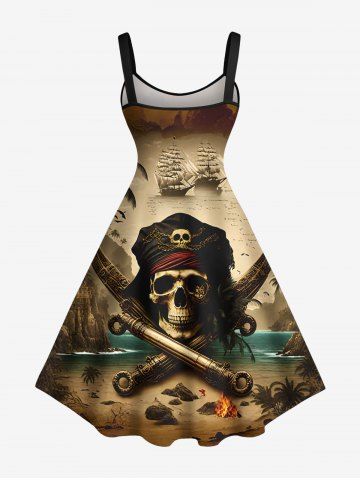Plus Size Coconut Tree Pirate Skull Fire Flame Boat Cruise Print Hawaii Tank Dress - Tan - L