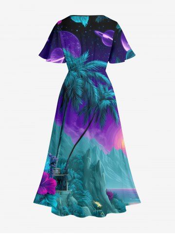 Graphic Dresses > Plus Size Coconut Tree Planet Galaxy Mountain Print Hawaii Split Pocket A Line Midi Dress