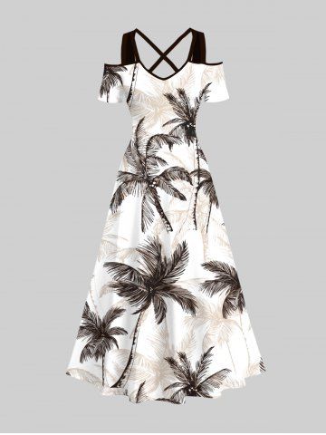 Graphic Dresses > Plus Size Coconut Tree Print Cold Shoulder Crisscross Hawaii Maxi Dress