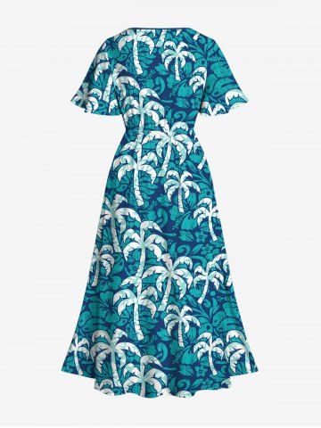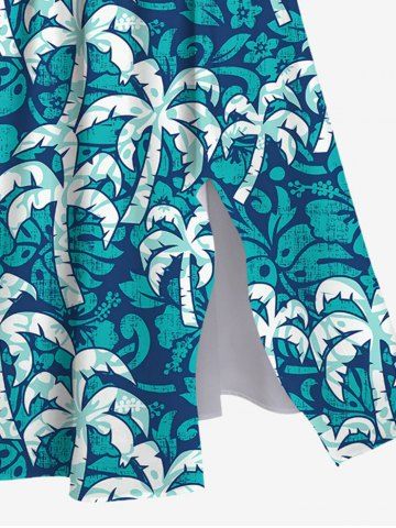 Plus Size Coconut Tree Print Hawaii Split Pocket A Line Dress - Green - 2x