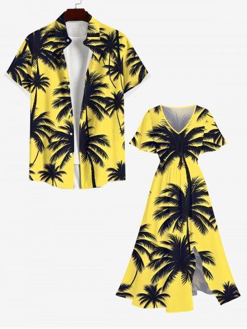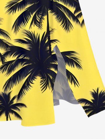 Plus Size Coconut Tree Print Split Hawaii Midi Dress - Yellow - L