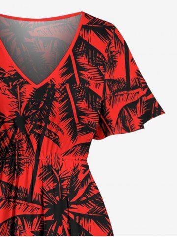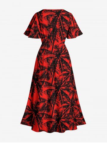 Plus Size Coconut Tree Print Split Hawaii Midi Dress - Red - L