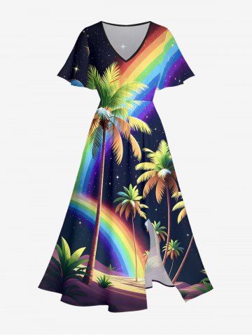Plus Size Coconut Tree Rainbow Glitter Stars Galaxy Print Hawaii Split Pocket A Line Midi Dress - Black - S