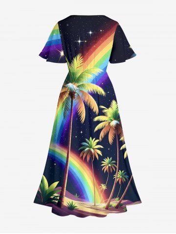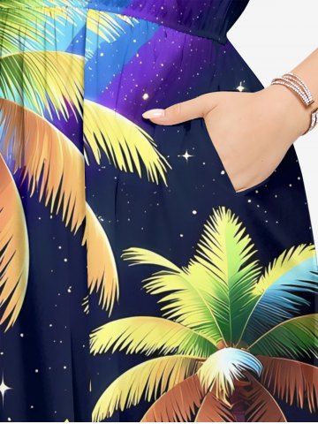 Plus Size Coconut Tree Rainbow Glitter Stars Galaxy Print Hawaii Split Pocket A Line Midi Dress - Black - L