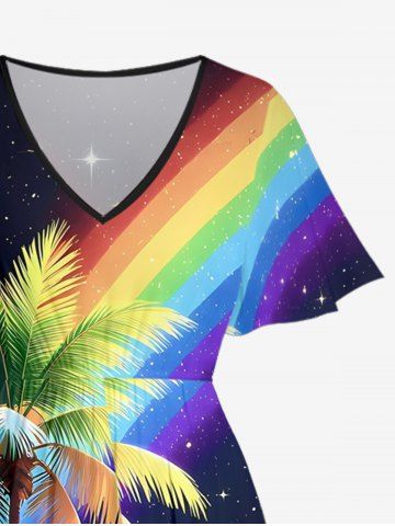 Plus Size Coconut Tree Rainbow Glitter Stars Galaxy Print Hawaii Split Pocket A Line Midi Dress - Black - 1x