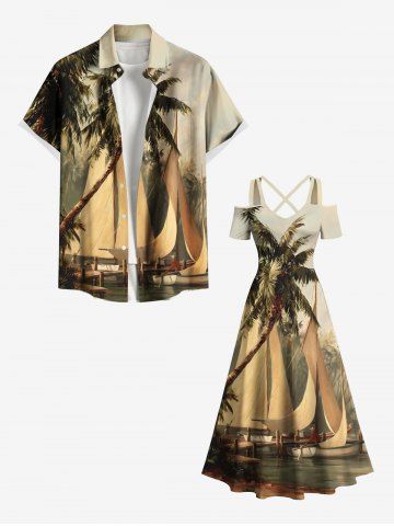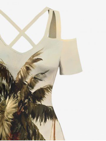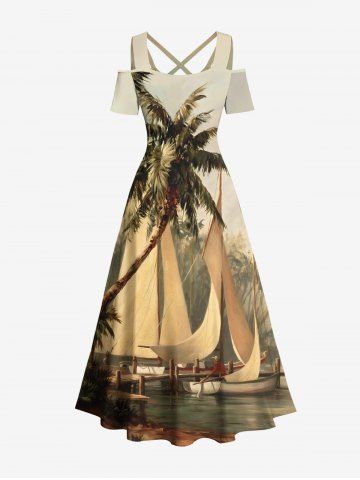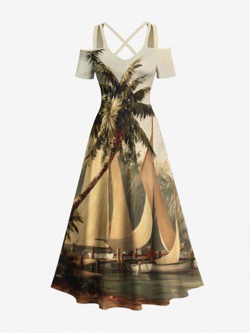 Plus Size Coconut Tree Sailboat Bridge Print Cold Shoulder Crisscross Hawaii Cruise Maxi Dress - Light Coffee - 3x