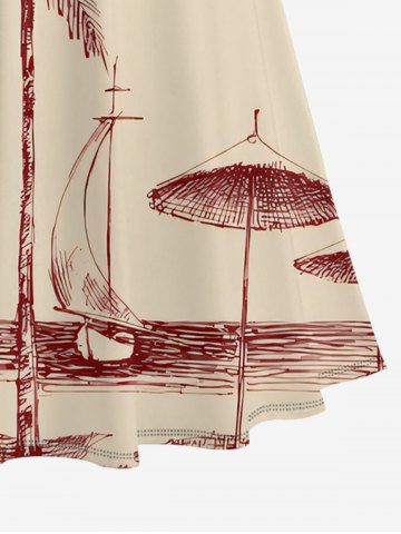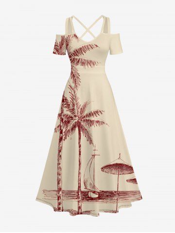 Plus Size Coconut Tree Sailboat Seascape Print Cold Shoulder Crisscross Hawaii Maxi Dress - Light Coffee - M