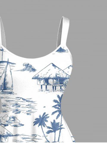 Plus Size Coconut Tree Sailboat Stone Print Hawaii Tank Dress - White - 4x