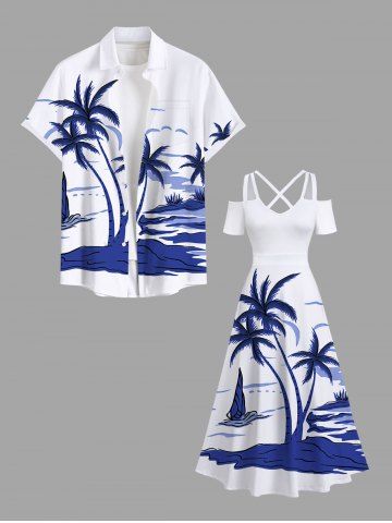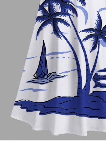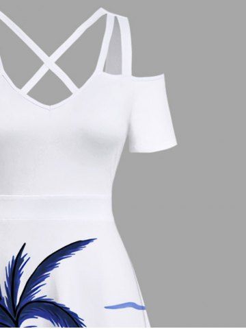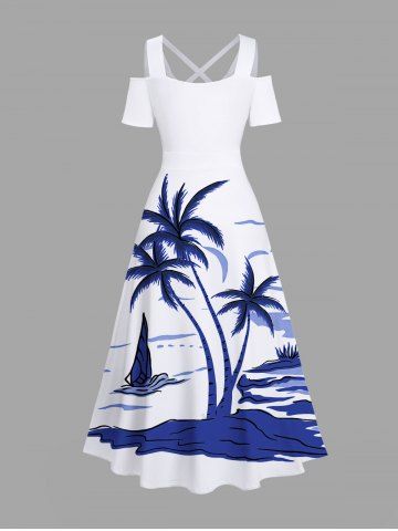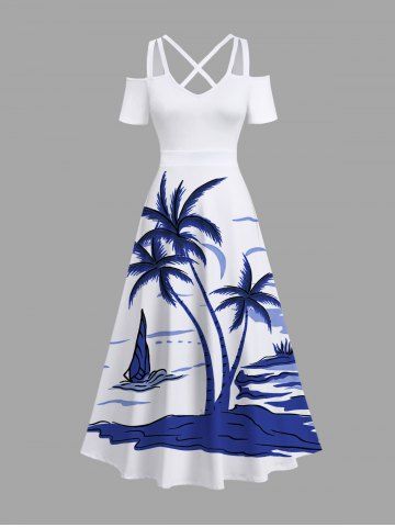 Plus Size Coconut Tree Sea Beach Moon Print Hawaii Cold Shoulder Crisscross A Line Maxi Dress - White - 4x