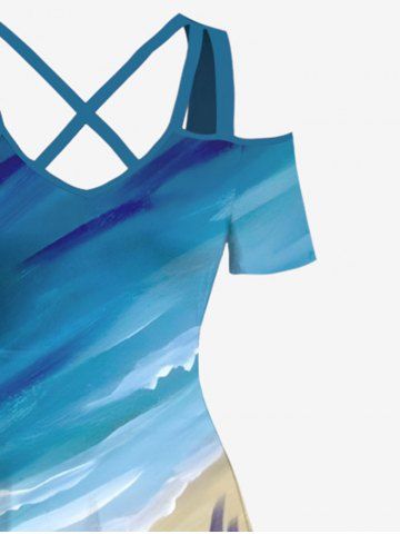 Plus Size Coconut Tree Sea Beach Print Hawaii Cold Shoulder Crisscross A Line Maxi Dress - Blue - S