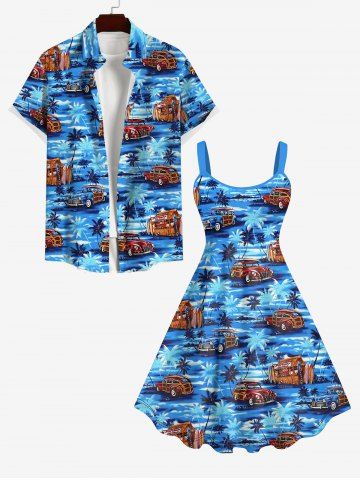 Plus Size Coconut Tree Sea Car Print Backless A Line Hawaii Tank Dress - Blue - Xs