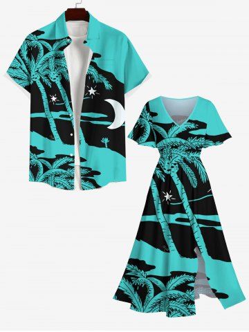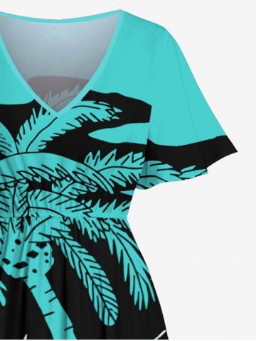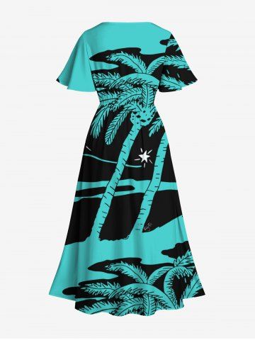 Plus Size Coconut Tree Sea Colorblock Star Print Hawaii Split Pocket A Line Midi Dress - Green - 2x