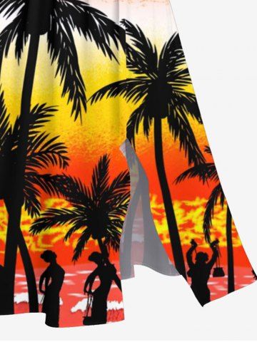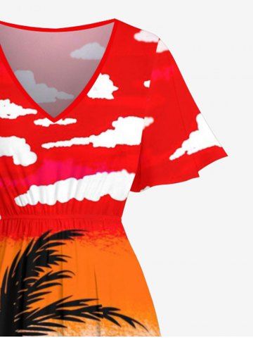 Plus Size Coconut Tree Sea Dancer Ombre Sky Cloud Print Hawaii Split Pocket A Line Midi Dress - Red - 5x