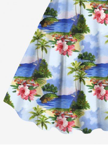 Plus Size Coconut Tree Sea Floral Cloud Print Hawaii A Line Tank Dress - Light Blue - 3x