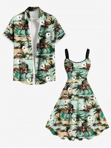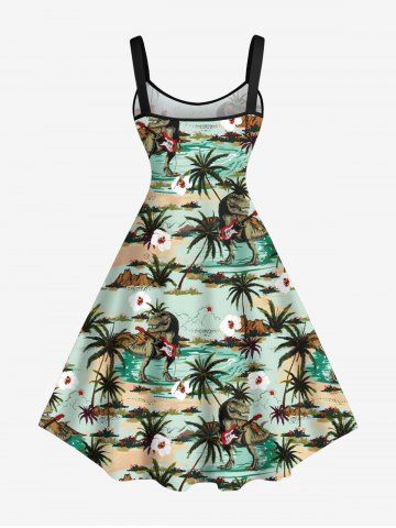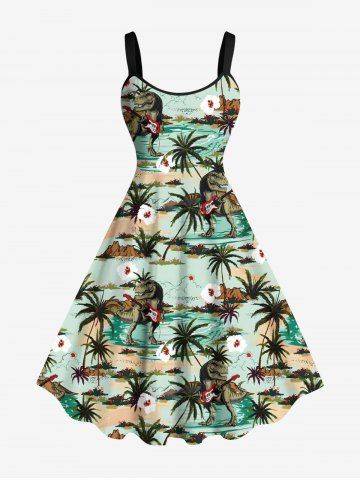 Plus Size Coconut Tree Sea Floral Dinosaur Print Hawaii A Line Tank Dress - Green - 1x