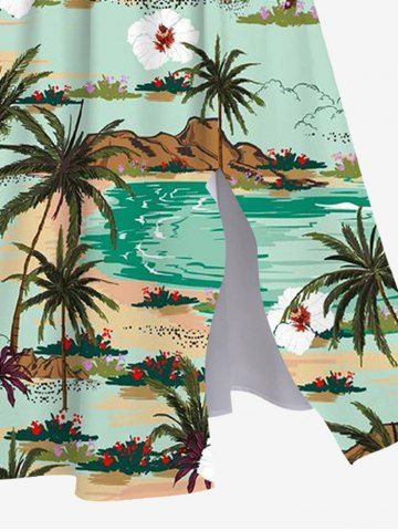 Plus Size Coconut Tree Sea Floral Mountain Print Hawaii Split Pocket A Line Dress - Green - 2x