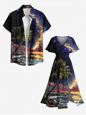 Plus Size Coconut Tree Sea Glitter Galaxy Print Hawaii Split Pocket A Line Midi Dress - Black - Xs